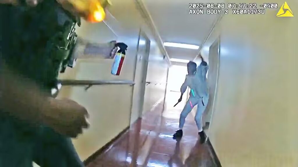 New Brunswick, New Jersey — On August 8, 2025, at approximately 4 a.m., officers from the New Brunswick Police Department were dispatched to an apartment building on Neilson Street, in response to a 911 call reporting that a female resident, later identified as 68-year-old Deborah Terrell, was disturbing other residents. Officers unsuccessfully attempted to speak with Terrell, as she refused to speak with officers or open her apartment door. Later, at 7:32 a.m., officers were again dispatched to the same apartment, after a 911 call reporting that Terrell was repeatedly going in and out of her apartment and threatening other tenants with a knife. In response, dispatch sent officers to Terrell’s apartment and contacted emergency medical services, requesting that EMTs be positioned outside the apartment building for a potential evaluation. At approximately 7:38 a.m., officers arrived at the apartment building and made contact with civilians, who confirmed observing Terrell with a large knife. Officers proceeded up an elevator and went to Terrell’s apartment.