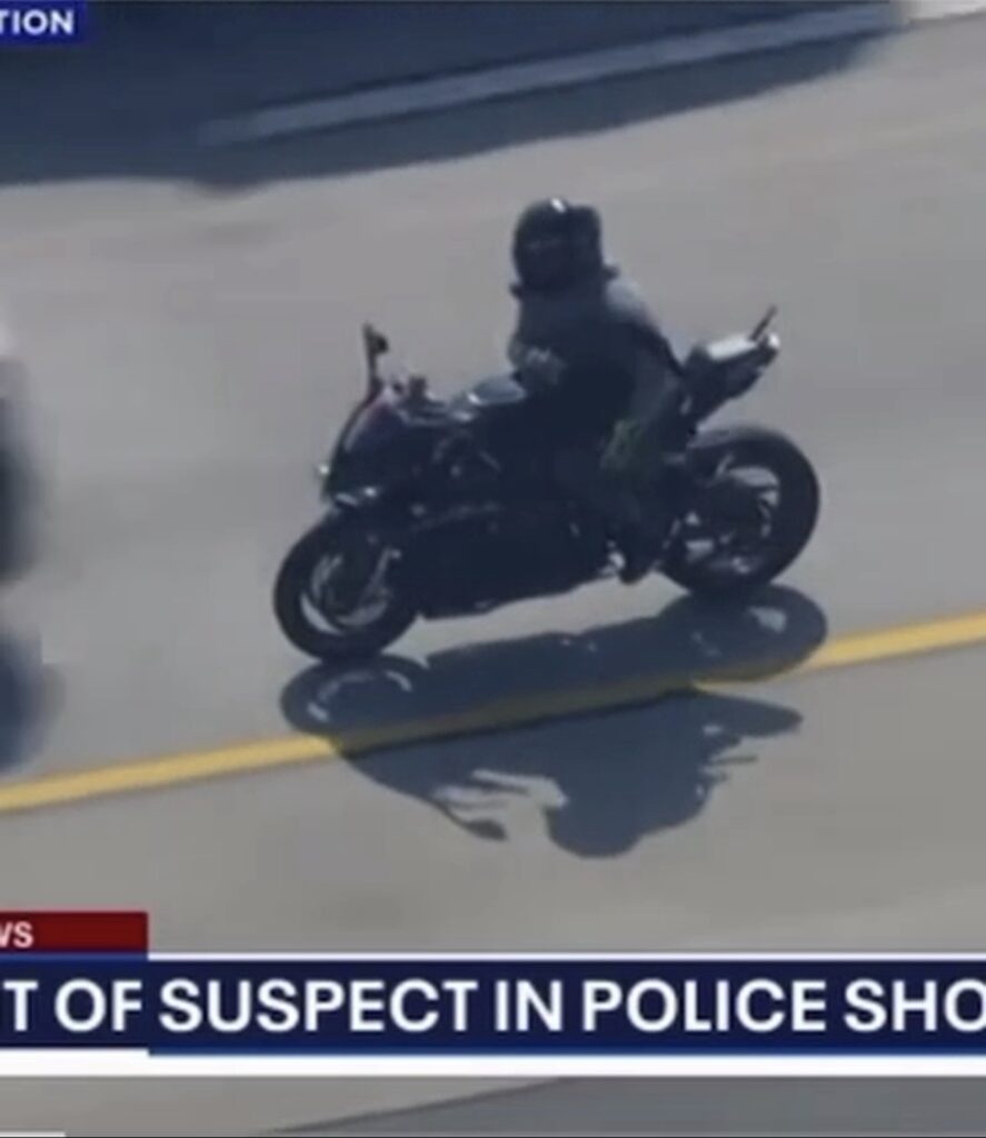 A suspect accused of fatally shooting a California deputy crashed his motorcycle into a moving car during a high-speed police chase on Monday, dramatic video shows.