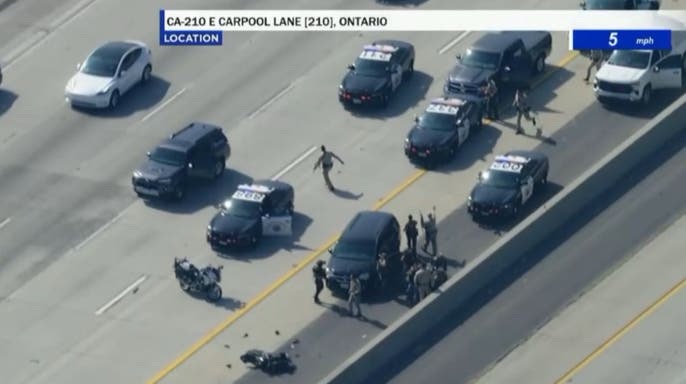 The armed suspect was fleeing after law enforcement were called to a domestic violence incident involving a woman in Rancho Cucamonga at around 12:37 p.m., the San Bernardino County Sheriff’s Office said.