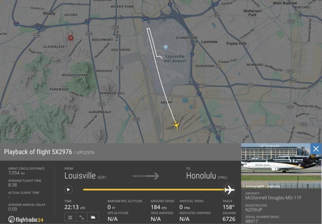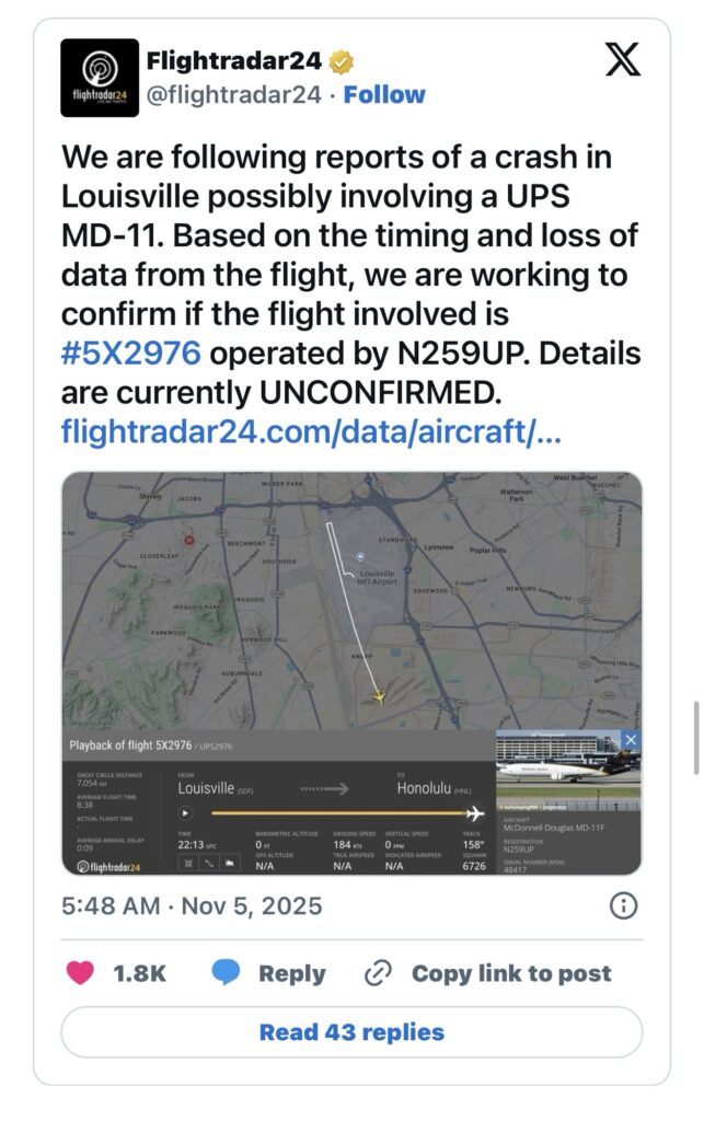 - Flightradar24 stated: “We are following reports of a crash in Louisville possibly involving a UPS MD-11. Based on timing and loss of data from the flight, we are working to confirm if the flight involved is #5X2976 operated by N259UP. Details are currently unconfirmed.”