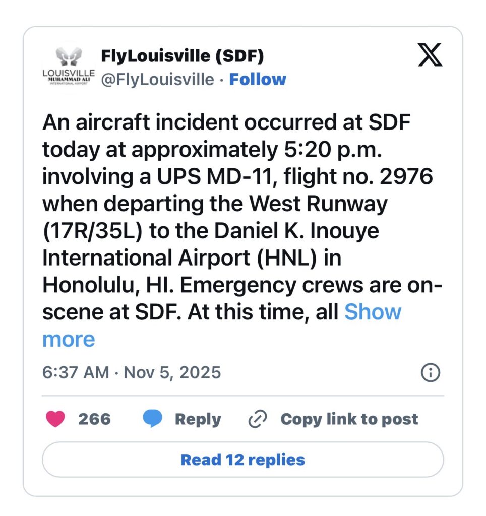 - UPS Airlines posted on X, saying, “UPS has been notified of an incident/accident involving one of our aircraft in Louisville, KY. Updates will be posted on https://about.ups.com/us/en/newsroom/statements.html as they become available.”