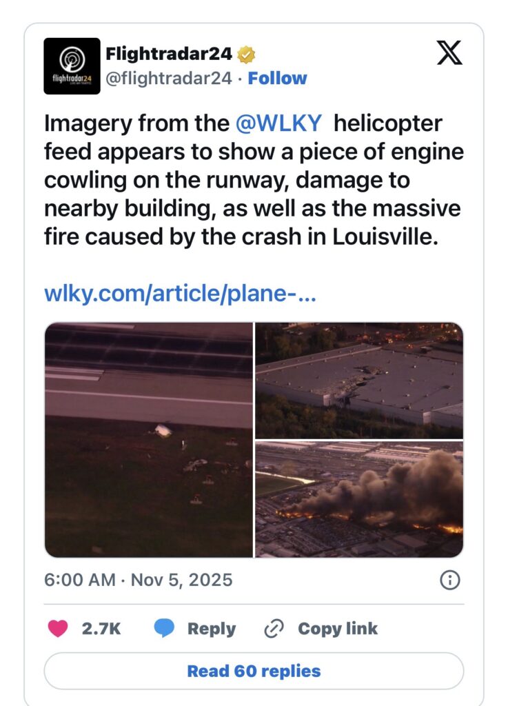 A UPS cargo jet crashed shortly after takeoff from Louisville Muhammad Ali International Airport (SDF) this afternoon (4 November 2025), sparking a massive fire and emergency response near the company’s Worldport hub.