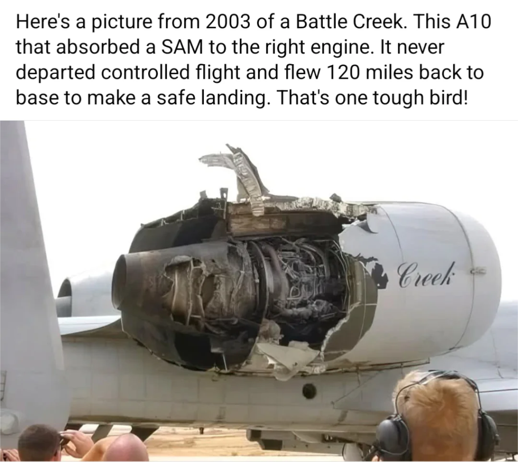 Equally important is the A-10’s redundant flight systems. The aircraft uses dual hydraulic systems, and if both are damaged, the pilot can still fly using a manual reversion mode. After the missile strike, despite losing parts of its control surfaces and suffering system failures, the A-10 remained controllable. The engines, mounted high and separated on the fuselage, continued to provide thrust even though one was partially damaged.